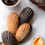 These chocolate orange madeleines are classic, light & airy french madeleines. They are extremely easy to make and are ready in no time. These delicate, little sea-shell shaped sponge cakes are sweet, buttery, and so delicious. The shells are orange flavored dipped in a shiny chocolate glaze and dusted with powdered sugar. These madeleines have slightly crisp edges with a soft melt in your mouth crumb throughout. They are so fluffy & go very well with a cup of your evening tea or coffee!