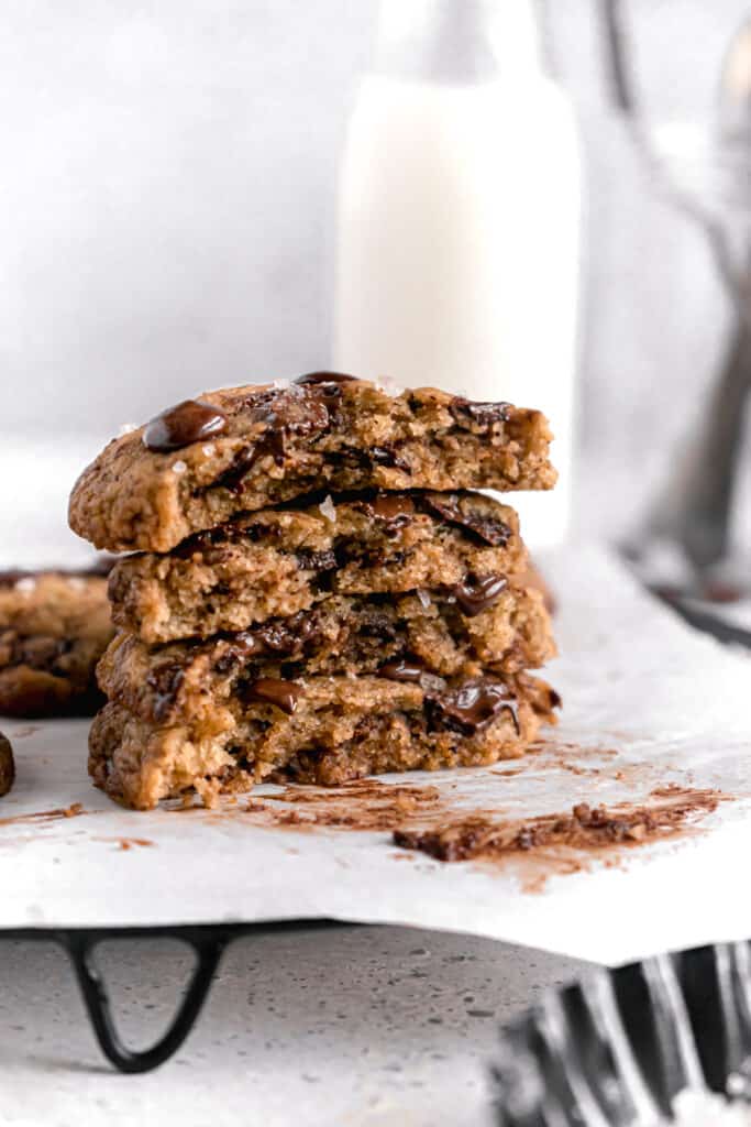 These bakery style double chocolate chip cookies are the ultimate chocolate chip cookie recipe you’ve been looking for throughout the year. If you’re like me and get lazy in the cozy winter months or after a hectic work day, you’ll not want to spend a lot of time baking an entire cake or going for a bakery run. Imagine having a cookie dough stash in your freezer for times like these that bake up in just 10 minutes and give you the flavours of a good bakery style chocolate chip cookie. These cookies are not only easy to bake up but also soft, chewy, have gooey centres and melty pools of chocolate. And if you weren’t already convinced, they require a very short chill time. You can also make them crisper if you like yours that way. They are truly incredible and I hope you and your family love them as much as I do!