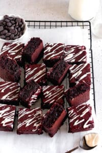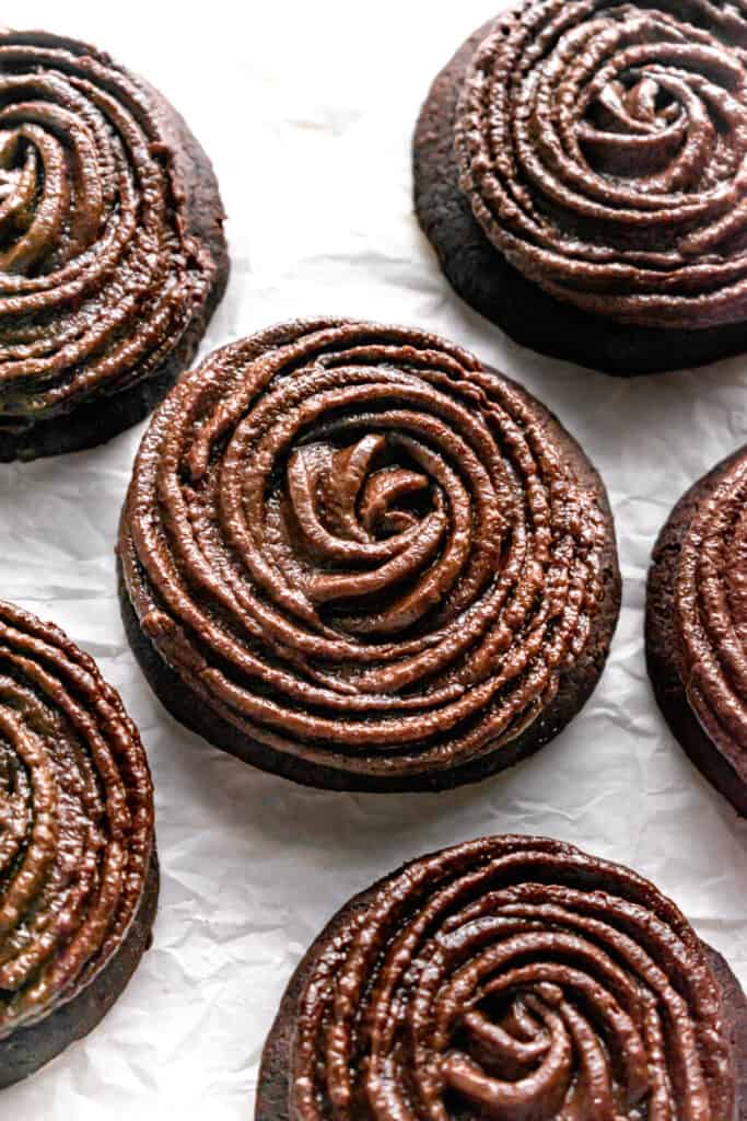These bakery style chocolate cookies are originally soft and that’s how I love them. But if you like your cookies more crisp, I’ve got you! If you would like a more crisp cookie, I recommend swapping out half of the all-purpose flour with bread flour. This will add crispness and chewiness to your cookies. A downside of using bread flour would be that these cookies dry out when stored, so it’s recommended to store them with a slice of bread in your container to help them retain moisture.